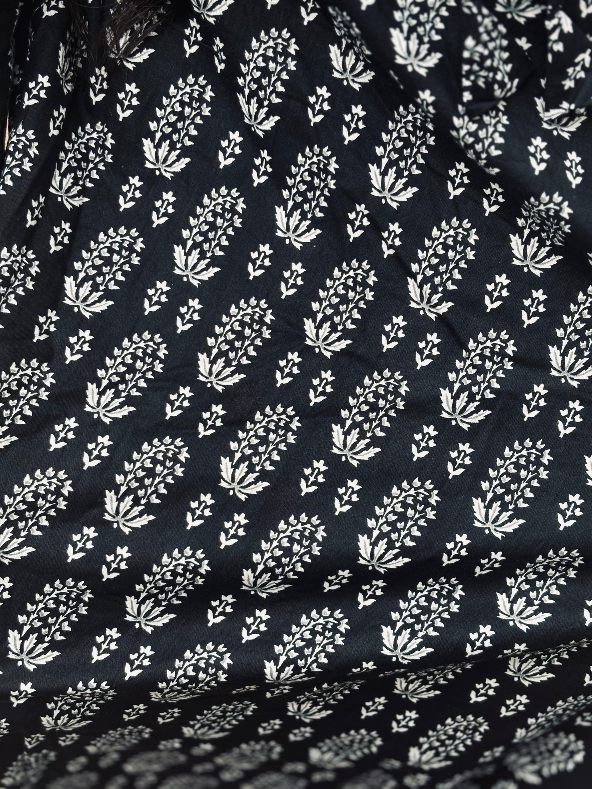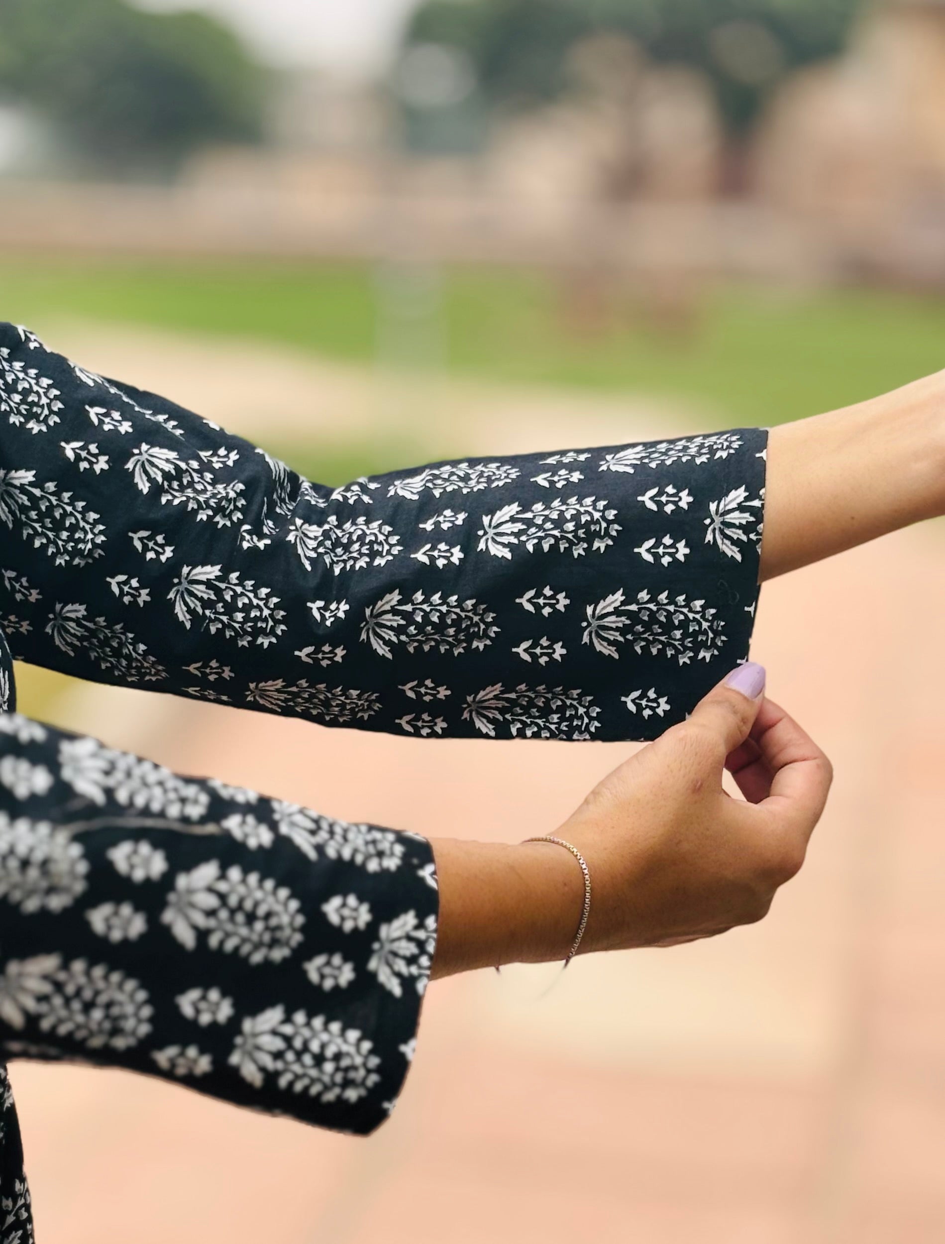 Elevate your everyday elegance with this timeless black handblock printed kurta set. Crafted from soft, breathable cotton, this ensemble beautifully combines traditional craftsmanship with modern comfort. The intricate white floral motifs on a deep black base exude a graceful charm, while the matching dupatta completes the look with understated sophistication.