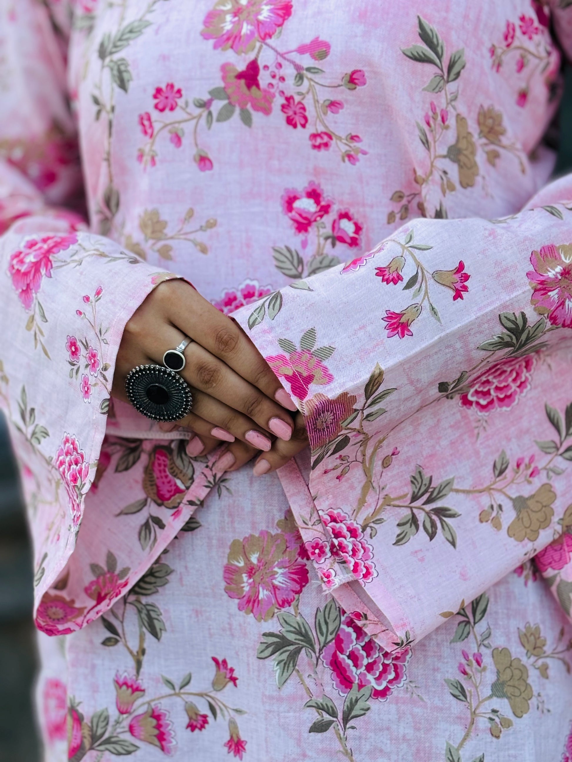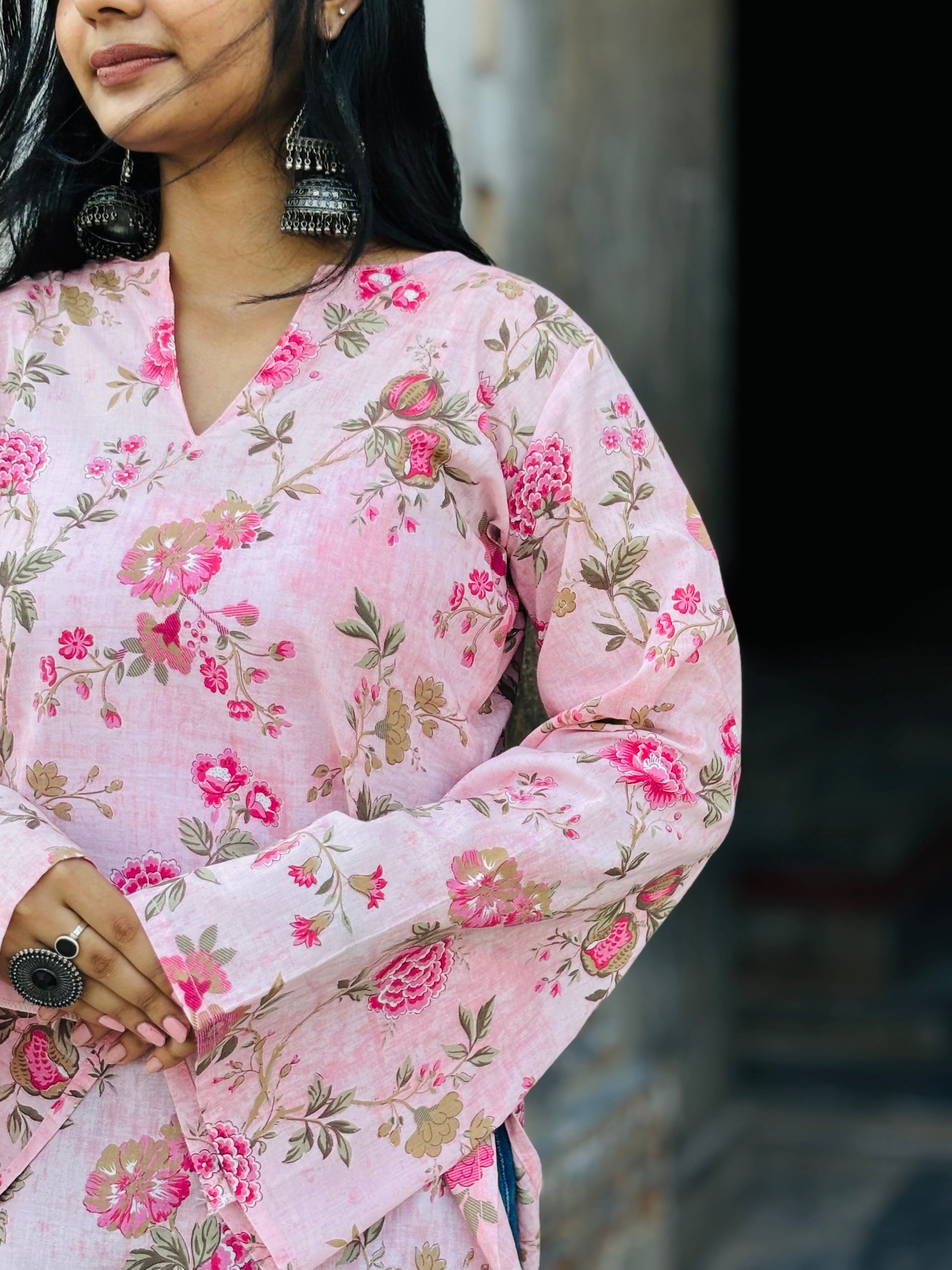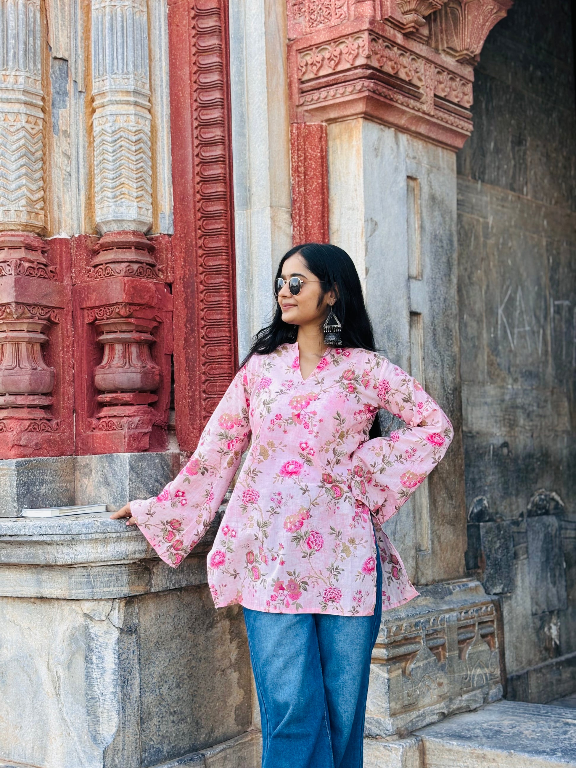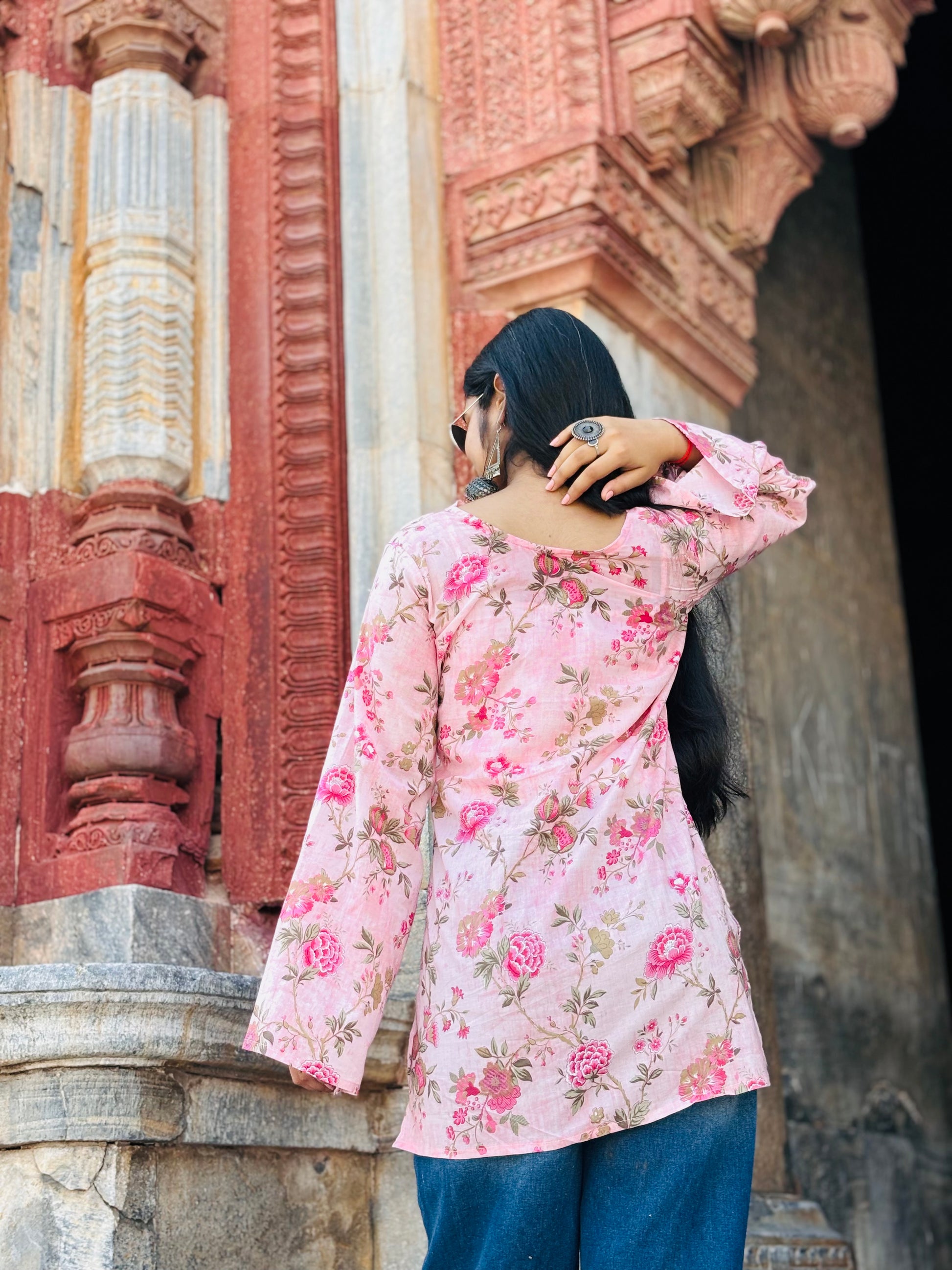 Made from soft, breathable fabric, this kurti is adorned with delicate rose motifs in vibrant pink hues, giving it a perfect blend of grace and comfort.