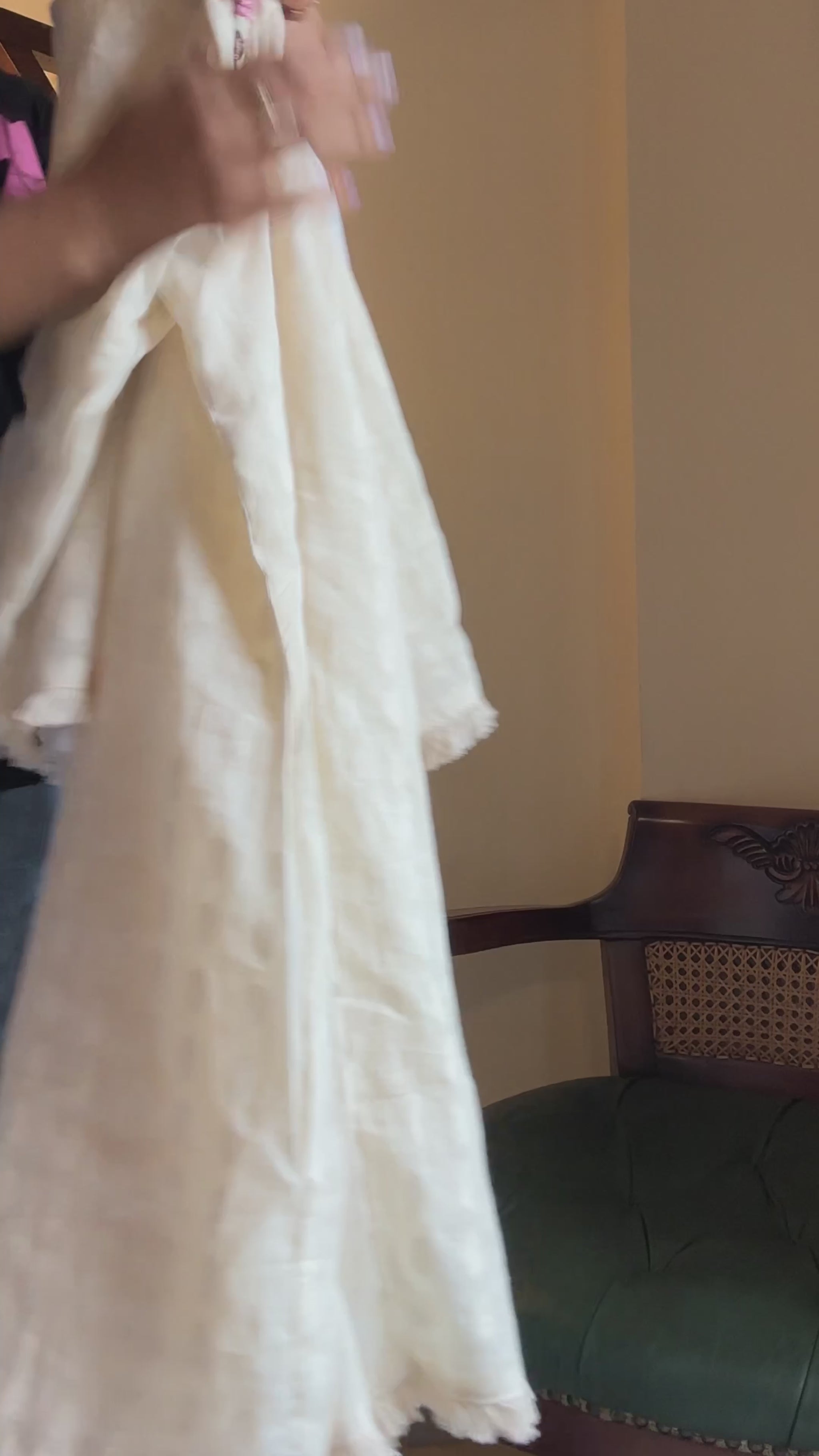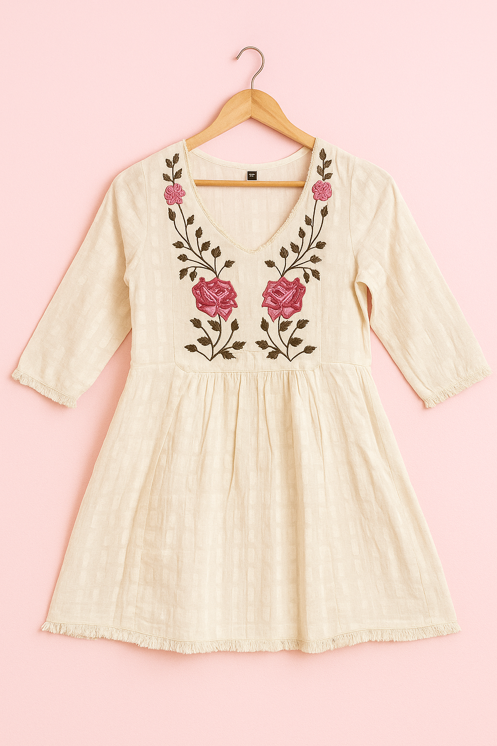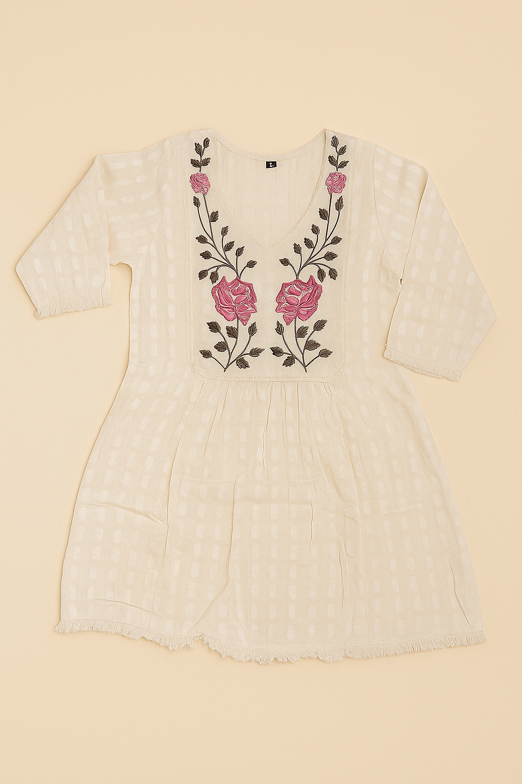 Add a touch of effortless elegance to your everyday look with this beautiful white cotton short kurti. Crafted from soft, breathable fabric with a subtle self-check pattern, it features delicate pink floral embroidery on the yoke that brings a feminine charm. The fringe hemline and 3/4th sleeves add a modern twist to the traditional silhouette.